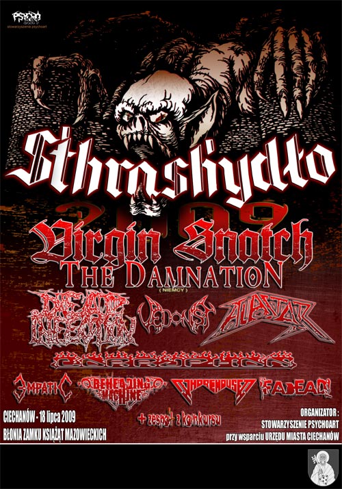 Po wielkich zmaganiach z przeciwnościami losu, możemy oficjalnie ogłosić skład tegorocznego S'thrash'ydła. Na błoniach Zamku Książąt Mazowieckich, jak to było w zeszłym roku, zagrają: ALASTOR, grający thrash metal, jeden z weteranów tego gatunku na polskiej scenie muzycznej, DEAD INFECTION, legendarna polska grupa spod znaku gore grind, królowie polskiego stoner metalu CORRUPTION. Pierwszy raz po reaktywacji będą gościć na scenie sąsiedzi za Odry, czyli niemiecki THE DAMNATION.