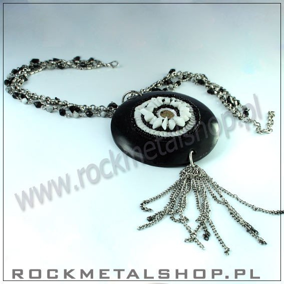 Naszyjnik dobrej jakości, bardzo solidny i masywny . Obwód naszyjnika wynosi około 44 cm, średnica wisiora wynosi około 7cm. Elementy naszyjnika wykonane ze stopu metalu oraz tworzywa sztucznego.