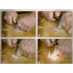 Aby rozpalić ogień należy zeskrobać trochę magnezjowych wiórków na przygotowaną podpałkę, a następnie energicznie przeciągnąć tępą stroną noża po iskrowniku.