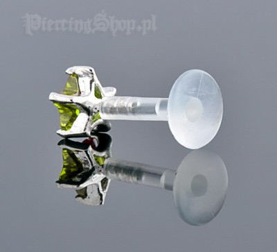 Kolczyk w kształcie gwiazdy, w kolorze oliwkowym do tragusa, niewielkiej chrząstki u ujścia kanału słuchowego po stronie ucha przylegającej do głowy lub do stosowania jako labret w brodzie, wardze itp. Jest bardzo wygodny i pięknie wygląda. Ozdoba platerowana, a pręcik o długości 8mm jest wykonany z PTFE dla Twojej ochrony. Oczywiście masz możliwość przycięcia pręcika na dowolną długość tak, aby spełniał potrzeby komfortu w noszeniu.