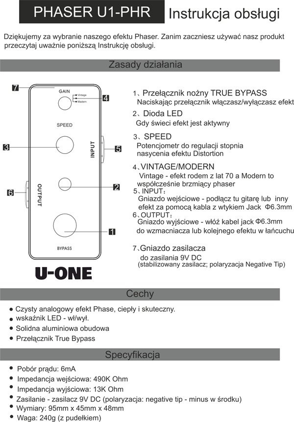 Phaser U-ONE - efekt "fazowania" czy inaczej zwany "pływajacej fali" znany już od lat '70. Popularny w rocku ale i w reggae oraz innych gatunkach muzycznych jest jednym z najczęściej nagrywanych efektów! U-ONE to nowa marka na rynku, wpisującą się w obecne trendy miniaturyzacji bez utraty jakości. Wybierając produkty U-ONE będziesz się cieszył z doskonałego brzmienia w bardzo przystępnej cenie! Zasilanie: zasilaczem 9 V DC (UWAGA! zasilacz nie jest w zestawie - polecamy stabilizowane zasilacze renomowanych producentów, np. JIM DUNLOP, EBS)