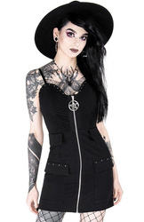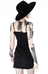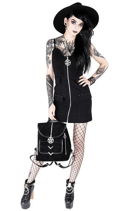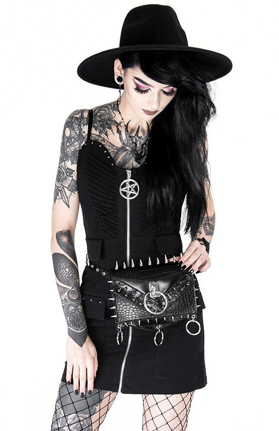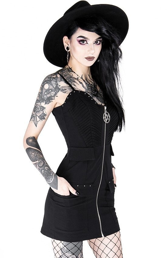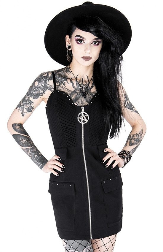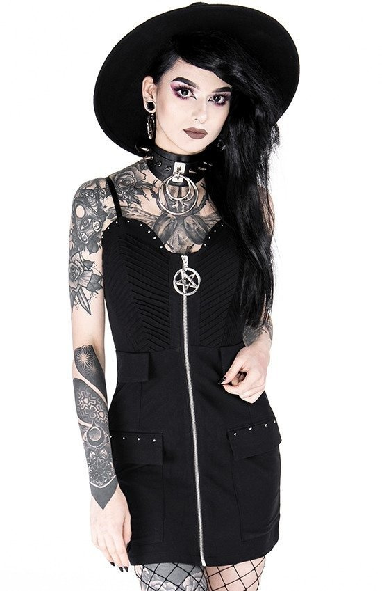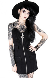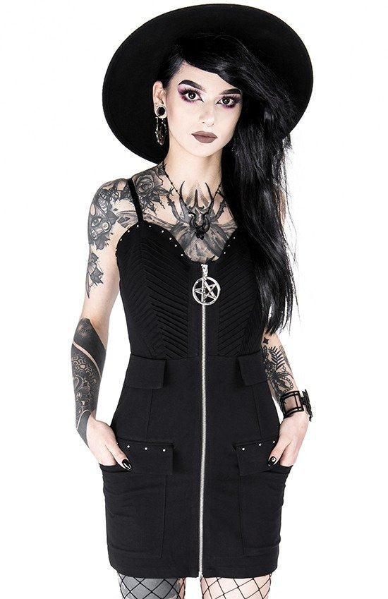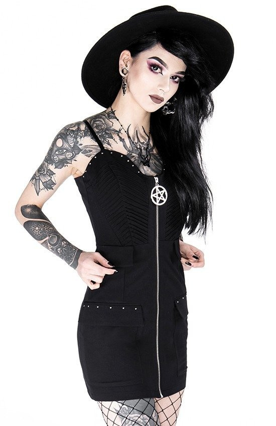 • Czarna gotycka, krótka sukienka na ramiączkach z ćwiekami i pentagramem.