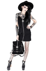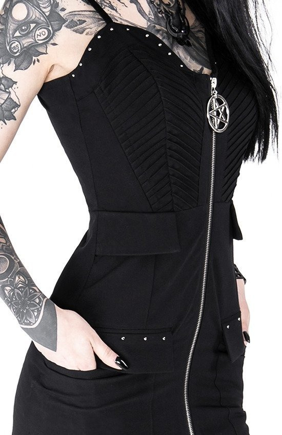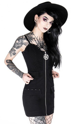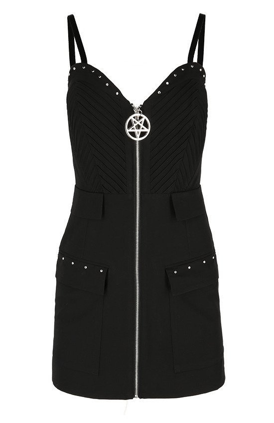 • Sukienka zapinana z przodu na metalowy zamek błyskawiczny zakończony suwakiem w kształcie pentagramu.