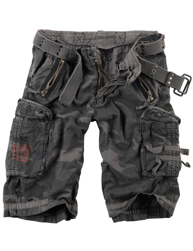 Spodnie Royal Shorts od Surplus to proste i wygodne spodenki o wojskowym designie, wzorowane na popularnych spodniach Vintage. Spodenki wykonane z wysokiej jakości dość lekkiej i miękkiej bawełny. Spodnie posiadają osiem kieszeni: dwie przednie wpuszczane na biodrach, dwie mniejsze przednie zapinane na zamek błyskawiczny, dwie na nogawkach zapinane na napy, oraz płaskie kieszenie na pośladkach. Talia regulowana bocznymi taśmami.Dodatkowo wszystkie spodenki posiadają bawełniany pas z metalową klamrą zaciskową.