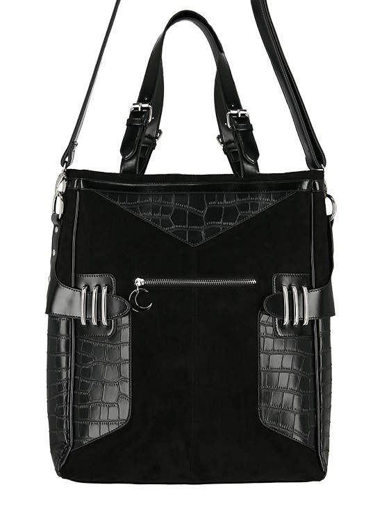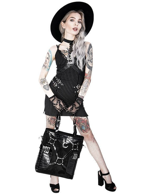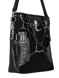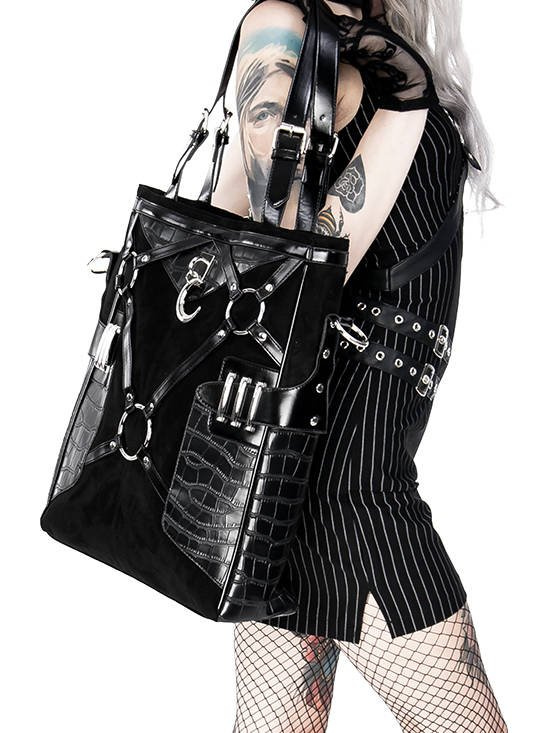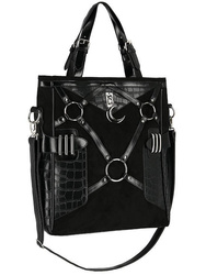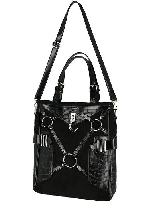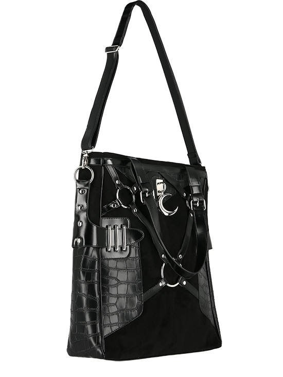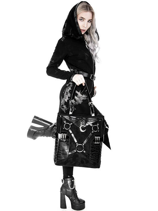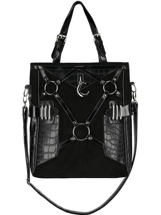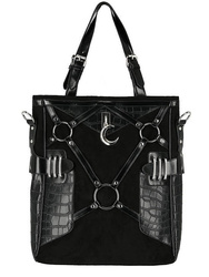 • Czarna, gotycka torebka shoperka z harnessem i półksiężycem.