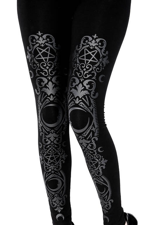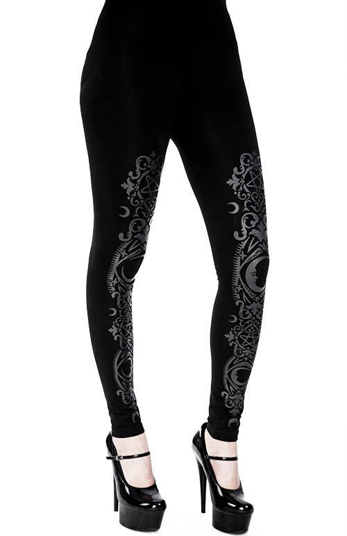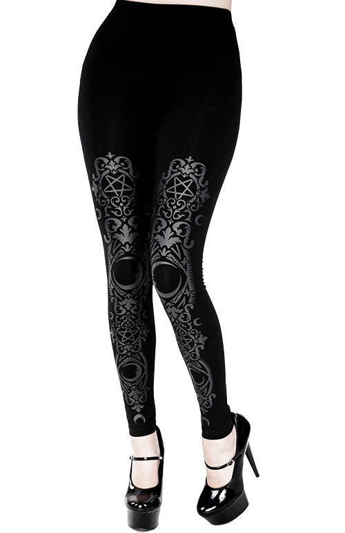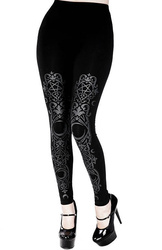 - Gotyckie legginsy z wysokim stanem w kolorze czarnym i barokowym nadrukiem.