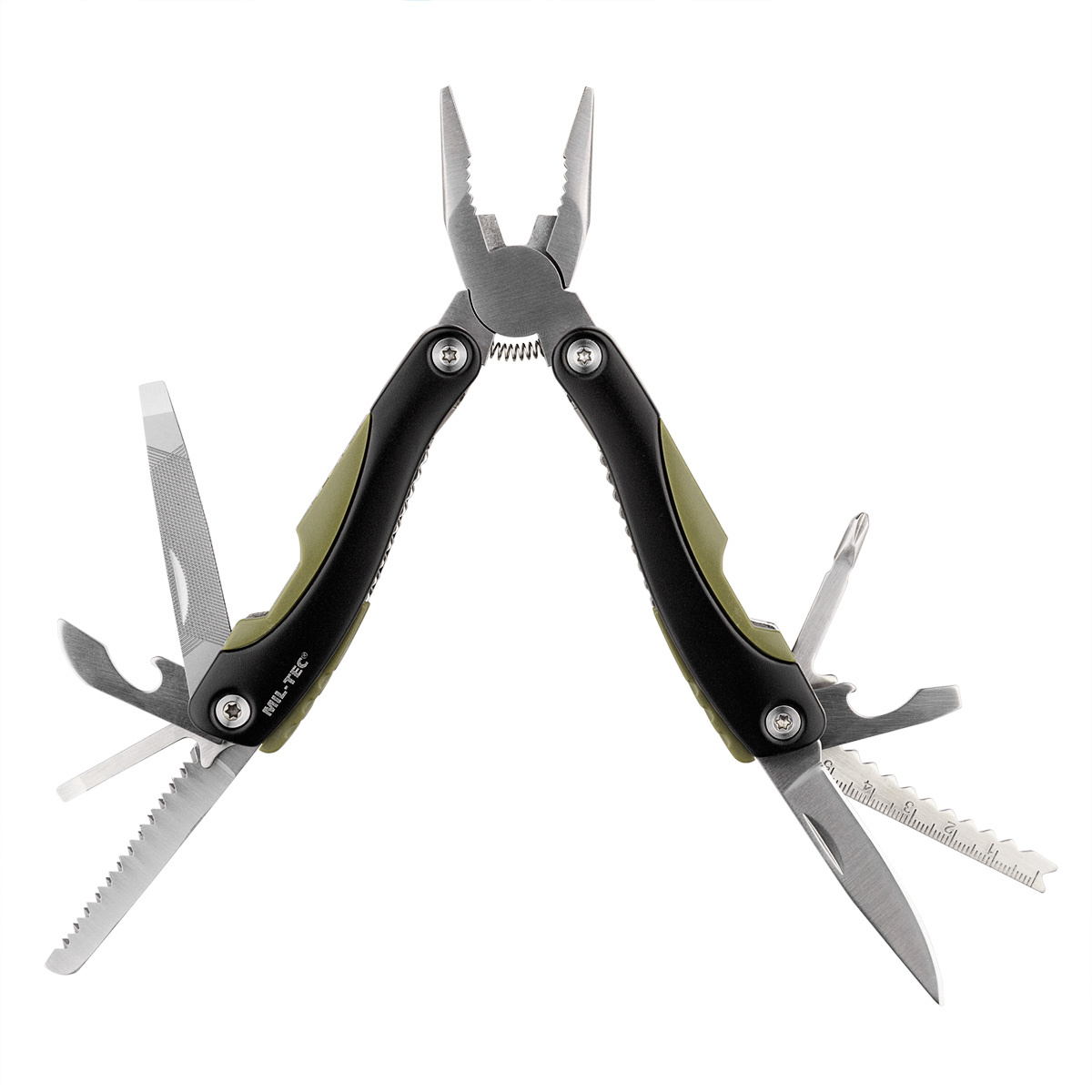 - składa się z 9 narzędzi: szczypce, pilnik, dwa śrubokręty płaski i krzyżak, otwieracz, otwieracz do butelek, nóż, piła, miarka