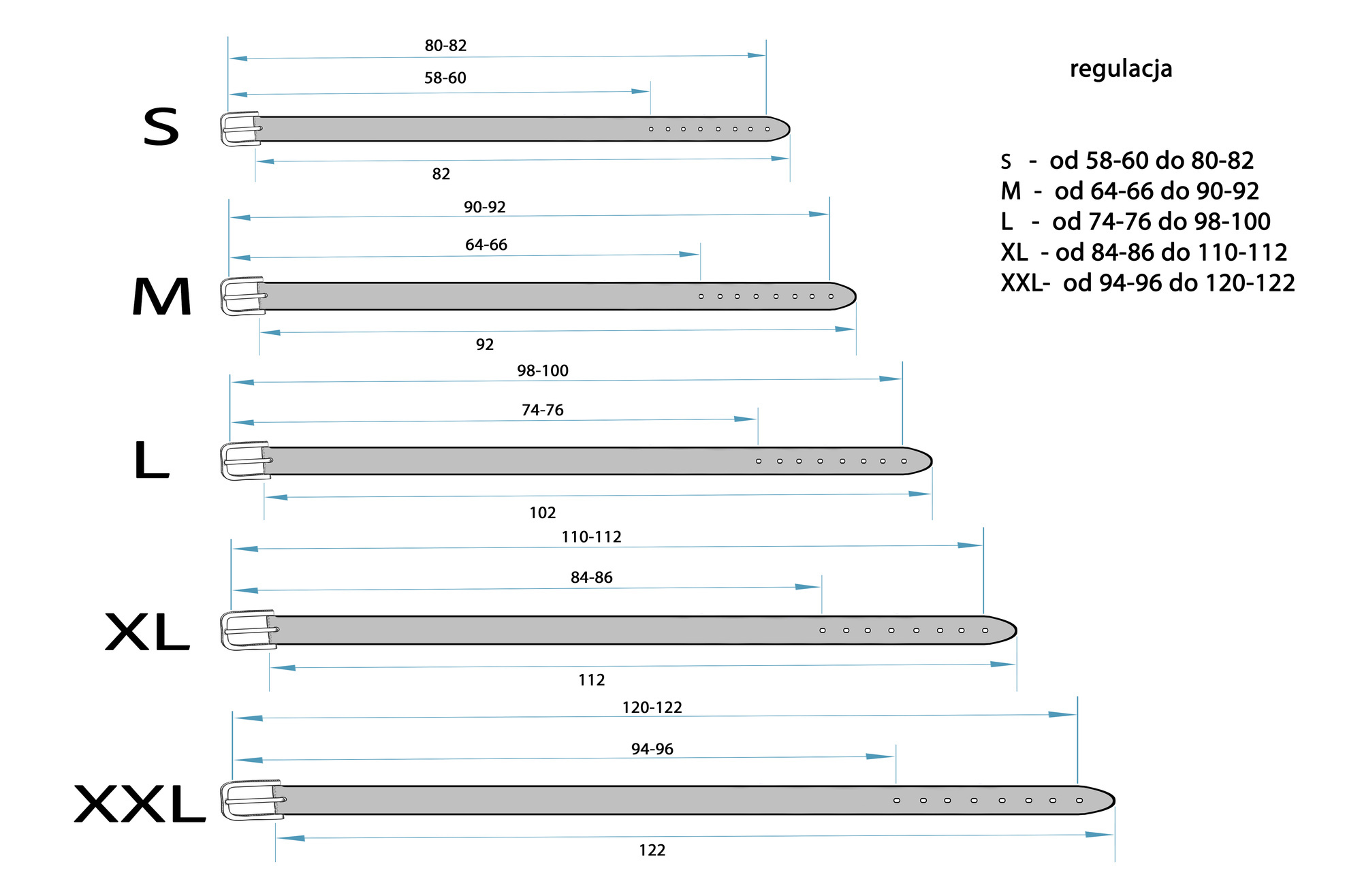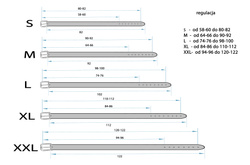Obwód pasa (od pierwszej dziurki do ostatniej dziurki):S - od 58-60 cm do 80-82 cm