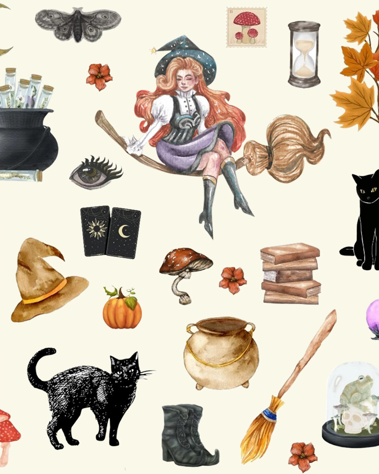 Show off your spooky side with our spells and potions print. Featuring Black carts, potions, cauldrons, a sexy witch and more. Add to your store today ready for the Halloween season.