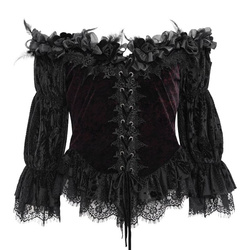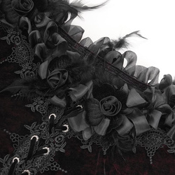 - Dekolt odsłaniający ramiona, ozdobiony kwiatami z materiału i wstążkami.