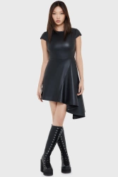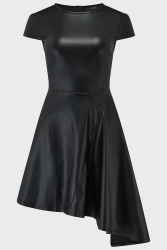 • Szew w talii z rozkloszowaną spódnicą i asymetryczną długością z jednej strony.