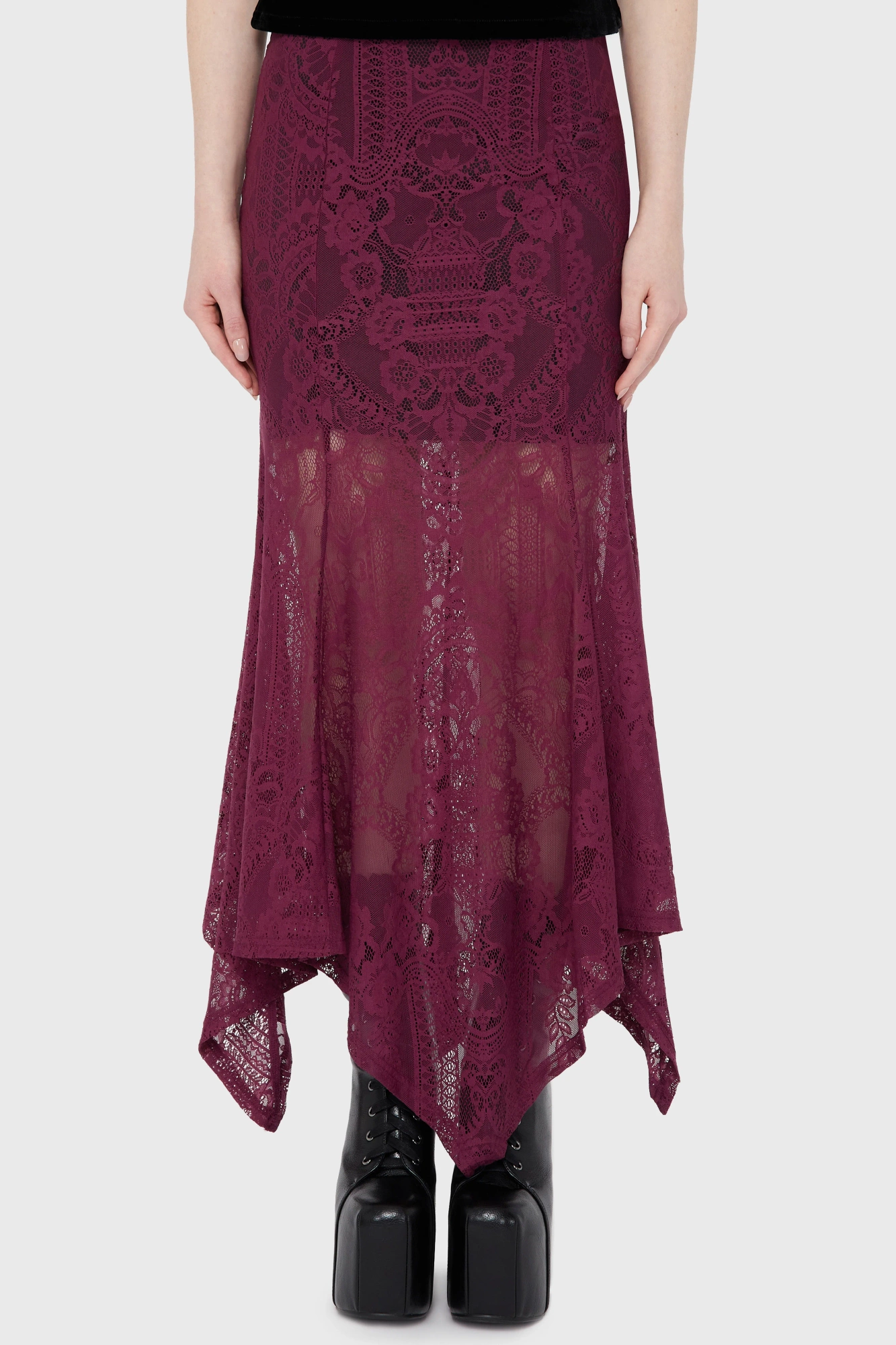 • Górna warstwa jest wykonana z koronki, a dolna znajduje się w górnej połowie spódnicy i jest wykonana z czarnego, nieprzezroczystego materiału.