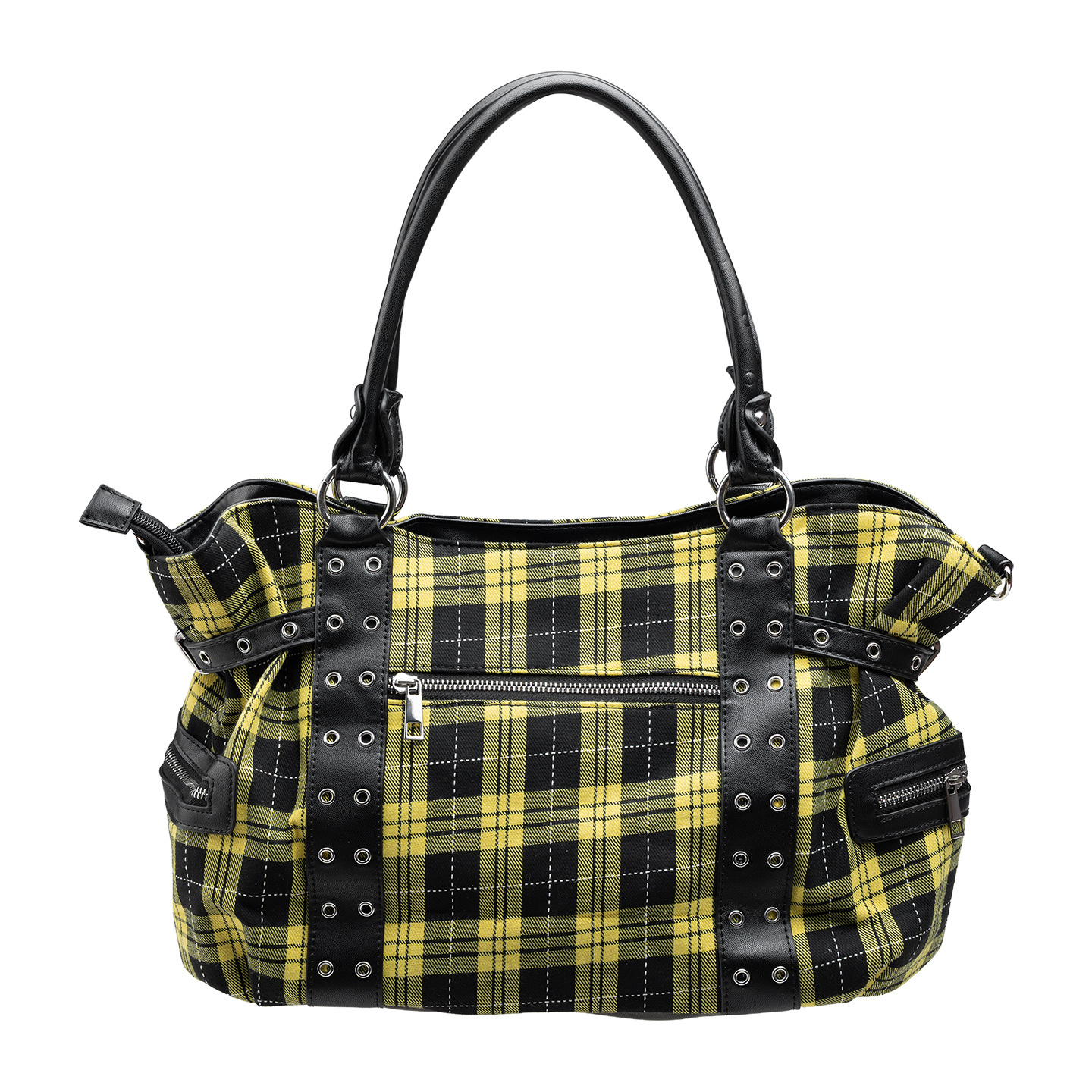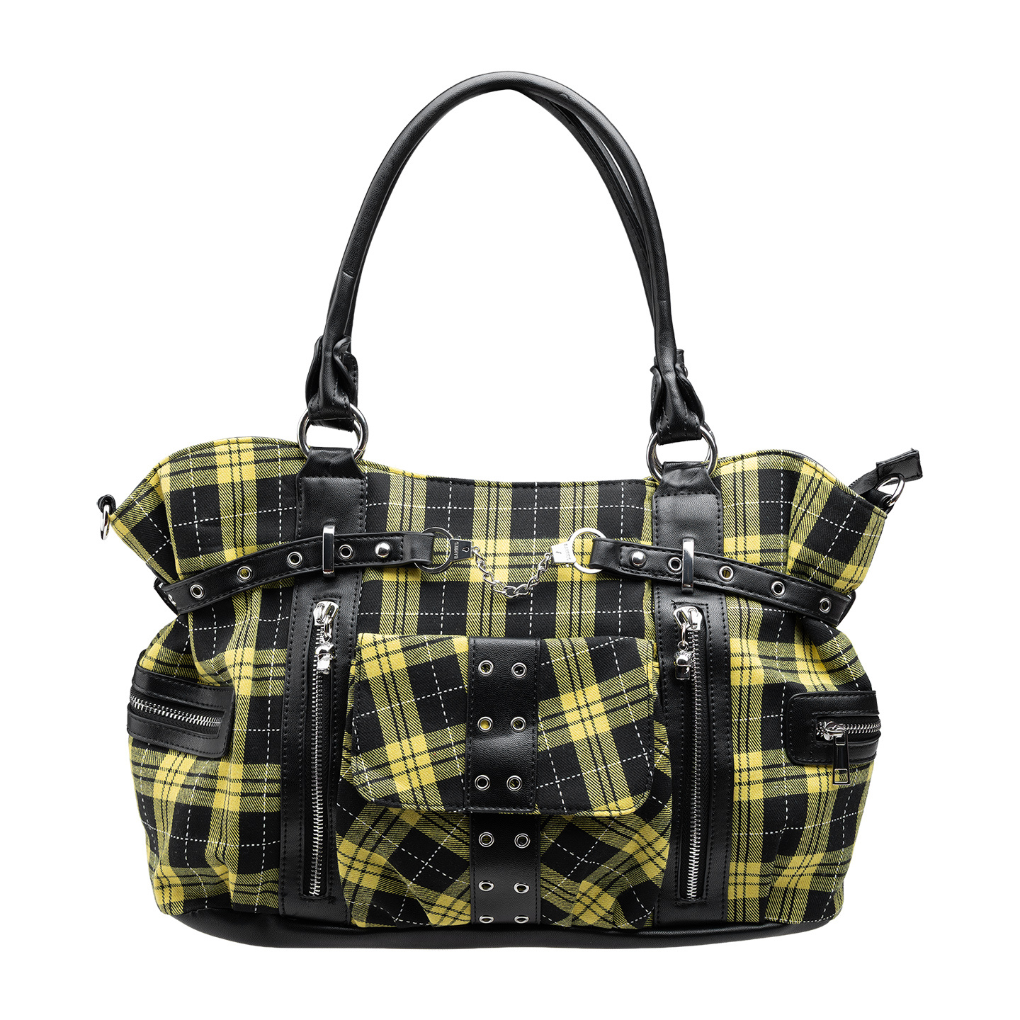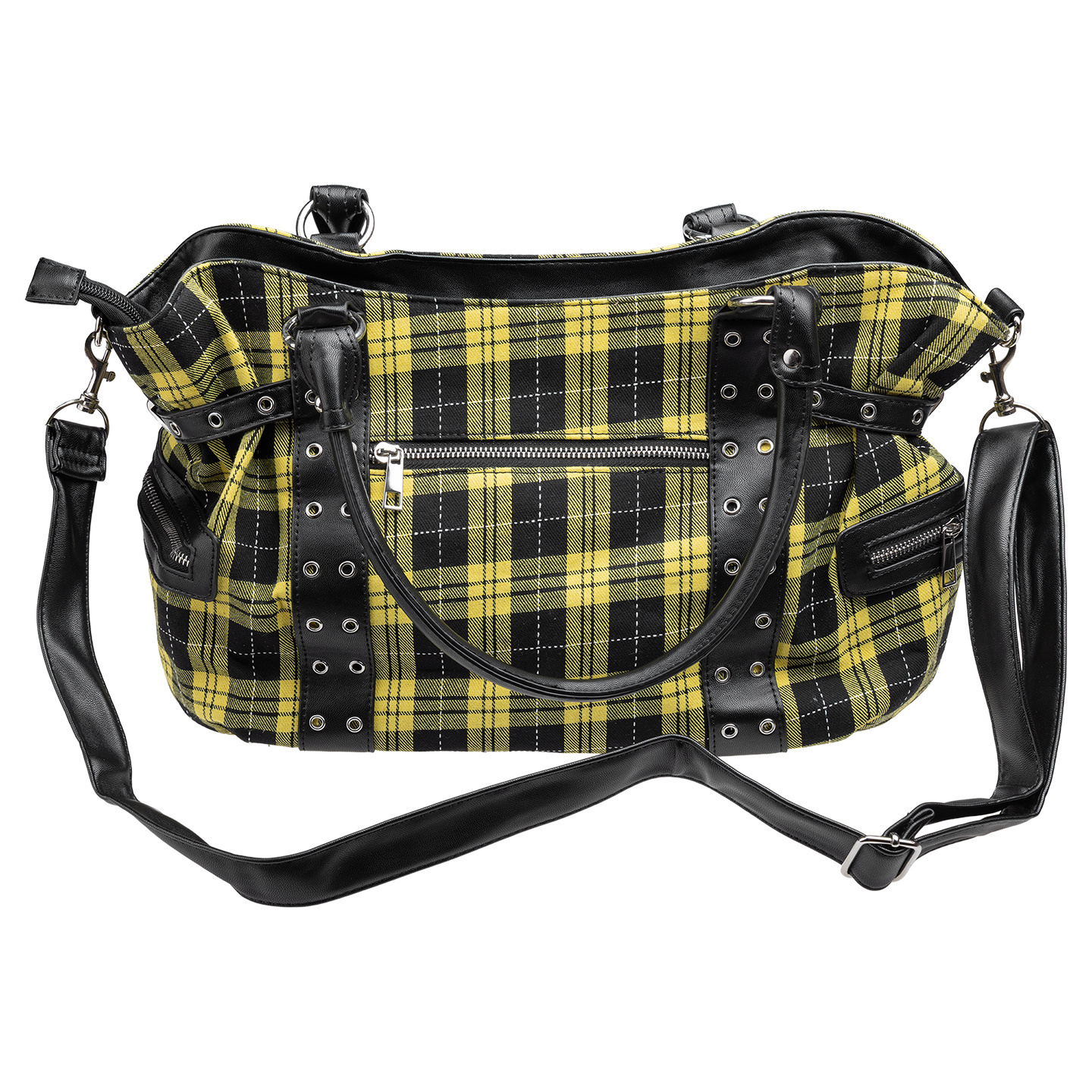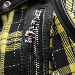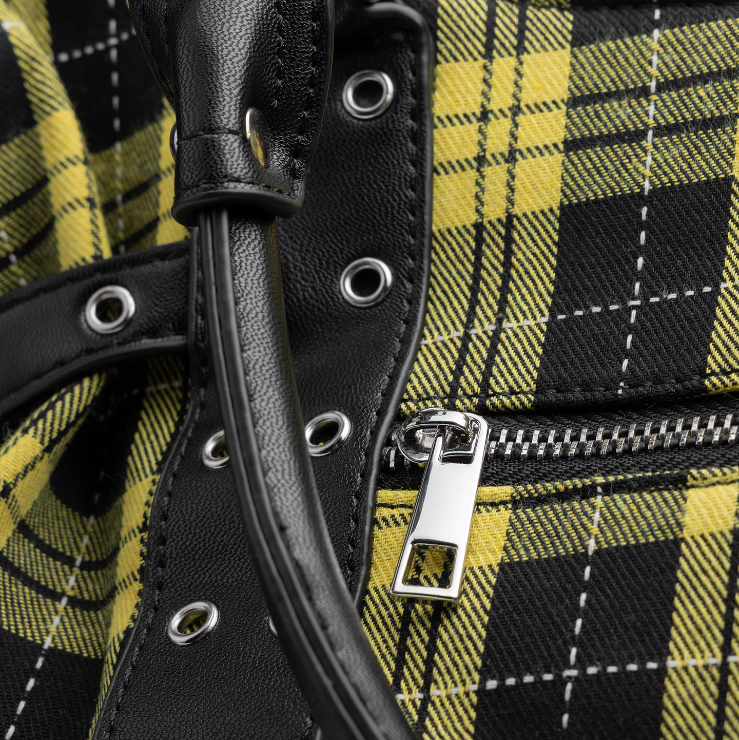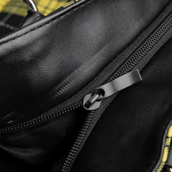 - Czarna sztuczna skóra kontrastuje z żółtą kratą.