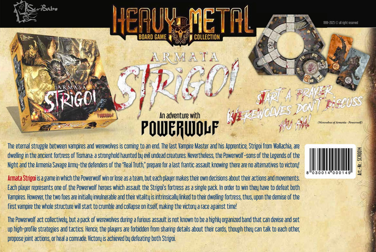 Wyrusz w ekscytującą, kooperacyjną przygodę inspirowaną muzyką i motywami zespołu Powerwolf z grą planszową Armata Strigoi – An Adventure With Powerwolf . Gracze wcielają się w członków stada Powerwolf , którzy wyruszają na decydujący atak na parę strzyg – potężnych wampirów ukrytych w starożytnej fortecy Tismana. Aby mieć szansę na zwycięstwo, muszą najpierw zdobyć punkty krwi, eliminując nieumarłe stworzenia, a następnie zmierzyć się z niebezpiecznymi strzygami w wyścigu z czasem, ponieważ forteca zaczyna się walić po pokonaniu jednej z nich.