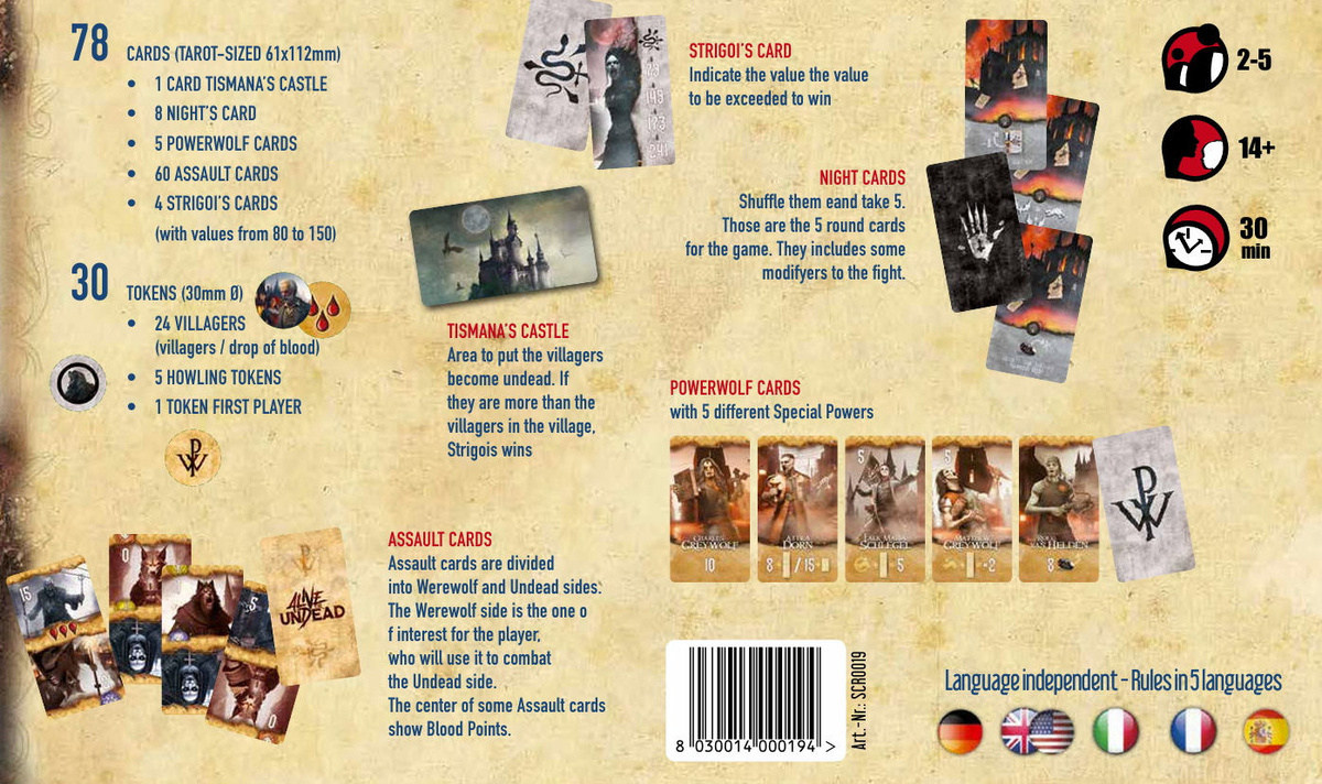 Wkrocz do mrocznego świata inspirowanego twórczością powermetalowego zespołu Powerwolf w tej kooperacyjnej grze karcianej „Alive or Undead – An Adventure With Powerwolf” , w której gracze mierzą się z hordą nieumarłych i wspólnie chronią małą wioskę przed zagładą. Gra oferuje emocjonującą walkę, taktyczne podejmowanie decyzji i pracę zespołową w atmosferze inspirowanej motywami i tekstami zespołu.