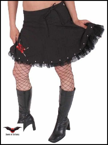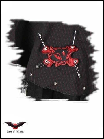Spódniczka mini z koronką. Czarna w cienkie, czerwone linie. Ozdobiona metalowymi nitami oraz przyczepianą za pomocą agrafek naszywką z wizerunkiem kotka.
