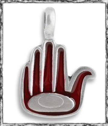 Wisior wykonany z pewteru. Powierzchnia wisiora polerowana jest specjalnym sposobem, dającym charakterystyczny matowy połysk. Motyw pomalowany i wypełniony masą z tworzywa sztucznego. Na górze przywieszki otwór na sznurek, rzemień lub łańcuch. Szerokość: 2,6 cm. Długość: 3,8 cm.